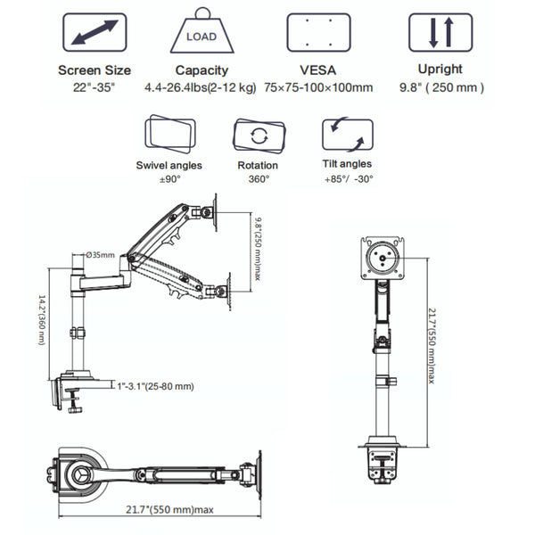 • Gas Strut spring mechanism for 360 degree movement swivel and tilt. Vesa support upto 100*100mm