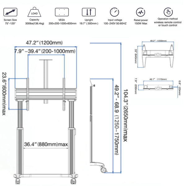 North Bayou Interactive Panel TV Motorised Stand Lift Heavy Duty | 136.4 Kgs Load Capacity | 1250-1750 mm Height | V70