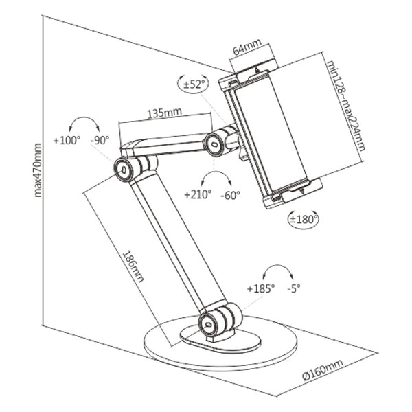 Universal Tablet Desk Stand, This universal tablet holder is suitable for most makes and models due to it's retractable holder, The holder grabs different sizes of tablets firmly, from 4.7" to 12.9" tablets, 3 pivoting points create flexible height and viewing angle adjustment, 360 degree rotation allows you to view your tablet in either landscape or portrait, Anti-slip rubber pads prevent scratches to surfaces, This stand can be left free-standing, or screwed to a surface if required (screws are not supplied), Maximum weight 1KG