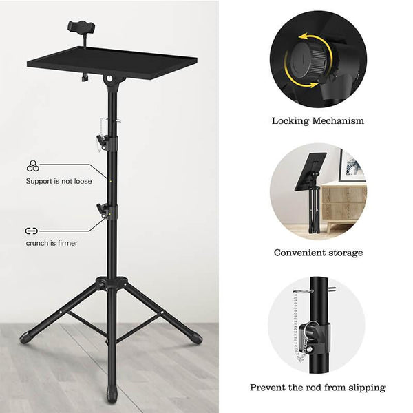 Experience the convenience of on-the-go presentations with our Foldable Laptop & Projector Tripod Floor Stand. This stand is adjustable in height, allowing you to easily find the perfect angle for your audience. The sturdy tripod design keeps your laptop or projector securely in place, while the lightweight and foldable construction makes it easy to transport and store. Perfect for use in classrooms, conference rooms, or at home, this stand is a versatile and convenient addition to any setup. Projector Stand Tripod Adjustable, Laptop Tripod Stand Height From 23.5 to 46.5 inches with Gooseneck Phone Holder, Laptop Floor Stand for Office, Home, Stage, Studio, DJ Racks Holder Mount