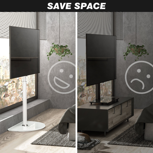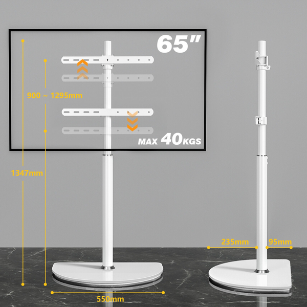 This Floor TV Stand is a sleek and space-saving solution designed to hold TVs from 32 to 65 inches. Built with durable alloy steel and a semi-circular tempered glass base, it offers strong support and a modern minimalist look that fits perfectly in living rooms, bedrooms or offices. The stand supports VESA mounting patterns from 100×100mm to 400×400mm and can hold TVs up to 40 kg (88 lbs).