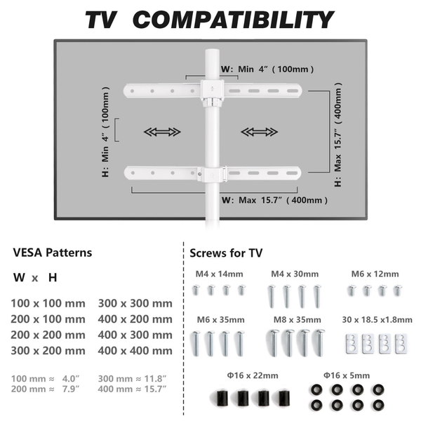 | VESA Compatibility | 100×100, 200×100, 200×200, 300×200, 300×300, 400×200, 400×300, 400×400 mm |