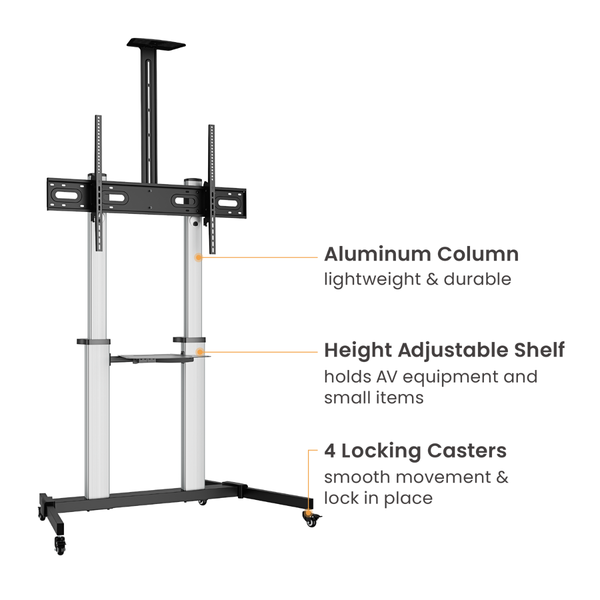 The FS44-610TW is a robust yet economical TV cart engineered for large-format displays. With vertical height adjustment, secure locking casters, cable management, and dual shelves for equipment and cameras, it delivers dependable mobility and clean aesthetics for modern professional environments.