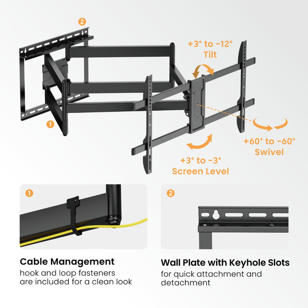 • Extra-Long 1080 mm Extension Arm: Pull the TV out further than standard mounts to cover multiple viewing zones effortlessly.